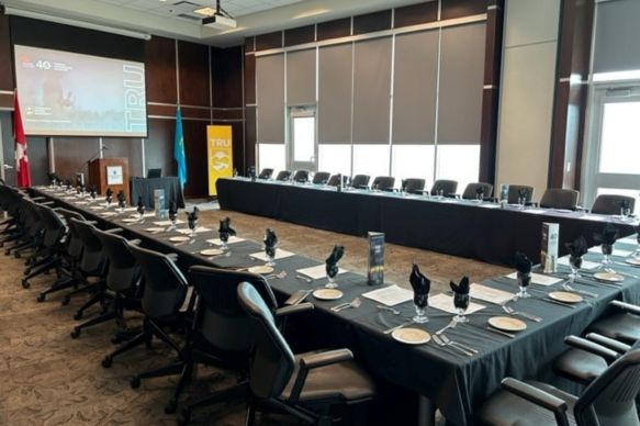 Centrally located on campus, this flexible event space can be divided into three smaller rooms to suit the needs of your gathering. Warm wood accents and abundant natural light from oversized windows create an inviting atmosphere, while a private patio offers guests exceptional views of the Kamloops valley. This flexible space is ideal for meetings, workshops and social gatherings.