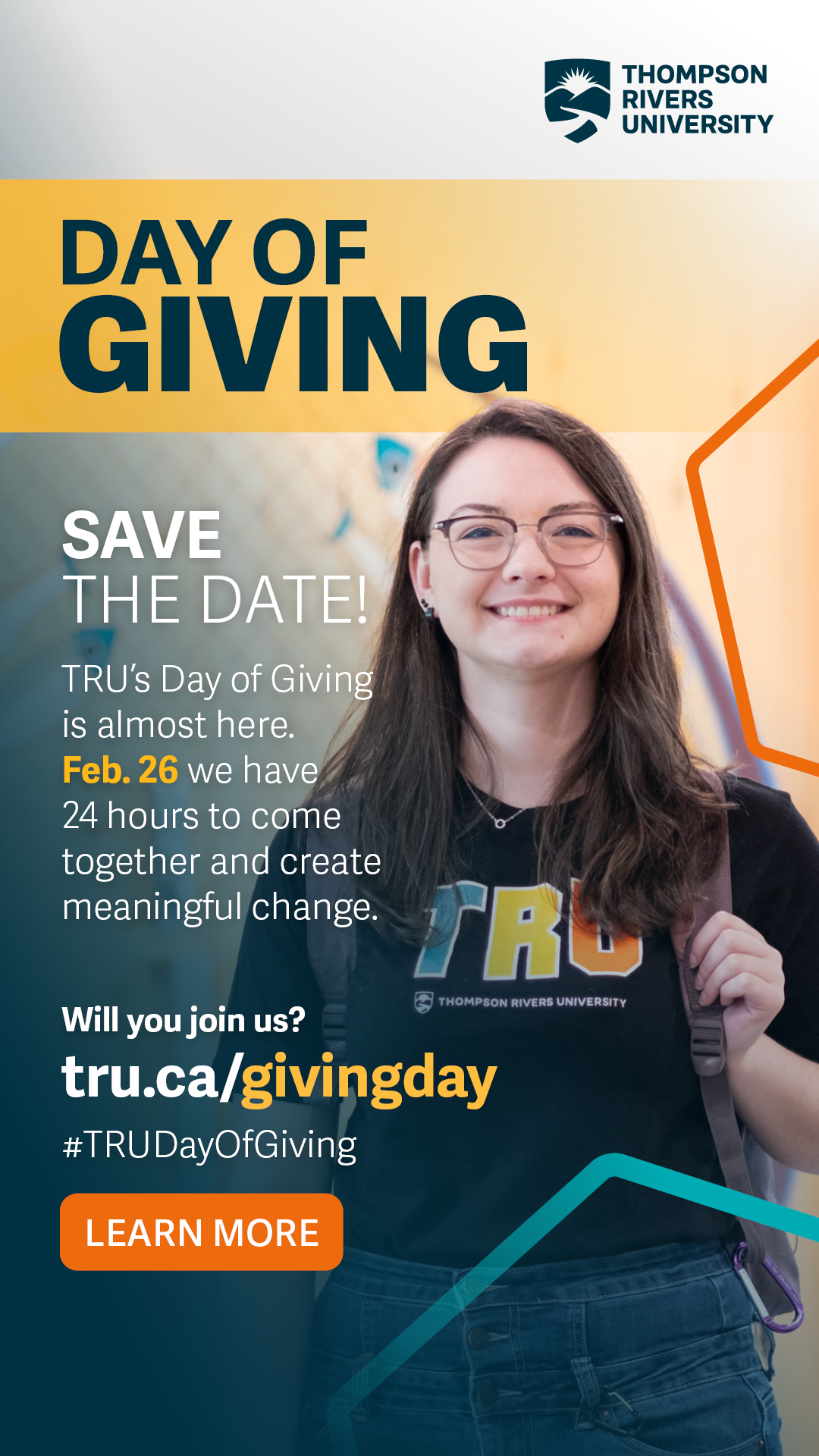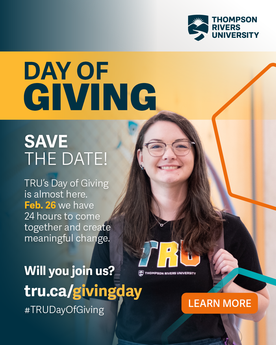 This year, TRU Day of Giving runs from midnight to 11:59:59 p.m. PT on Thursday, Feb. 26. Every dollar raised helps TRU students achieve their dreams and enhance their learning experiences.